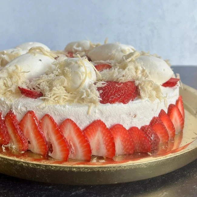 This is a light, 1 layer cake version frosted with plenty of whipped cream and fresh strawberries. Its fresh and sweet but not too sweet to share with family and friends. A great, classic vanilla cake that also works well with the fruit of the season!